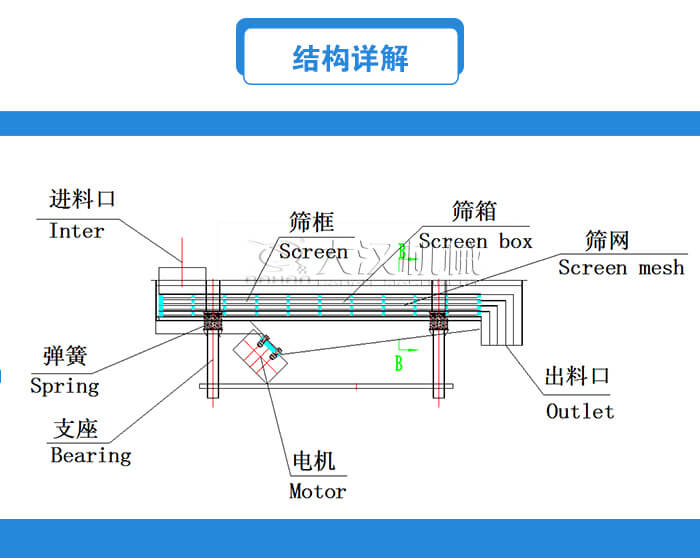 主要由篩箱、篩框、篩網、振動電機、電機臺座、減振彈簧、支架等部分組成。