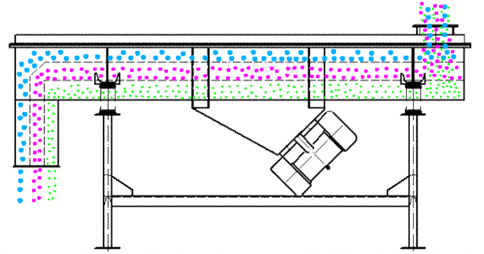 高頻直線篩采用雙振動電機驅動,當物料從給料機均勻地進入篩分機的進料口,在振動電機的激振下,向出料口方向邊跳動邊篩分,通過多層篩網篩分出數種產品和不合格的篩上、篩下物,分別從各自的出口排出,流入料倉或盛料筒,從而達到對物料進行篩選和分級的目的。