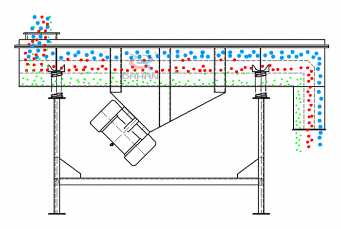 上振式直線振動篩是利用振動電機或普通電機外拖動或自振源驅動,使篩體沿激振力方向作周期性往復振動,物料在篩面上沿直線方向作拋物線運動,從而達到篩分目的。上振式直線振動篩由激振裝置、篩箱、防塵罩、落料斗、減振裝置、底座等部分組成。上振式直線振動篩工作時,由激振器產生的激振力通過篩箱傳遞給篩箱內的篩面上,因激振器產生的激振力為縱向力,迫使篩箱帶動篩網面作縱向前后位移,在一定條件下,篩網面上的物料因受激振力作用而被向前拋起,落下時小于篩孔的物料則透篩而落到下層,物料在篩網面上的運動軌跡為拋物運動,由于這樣周而復始的物料運動,物料從入料端落入篩箱后,迅速前進、松散、透篩,完成篩分作業。