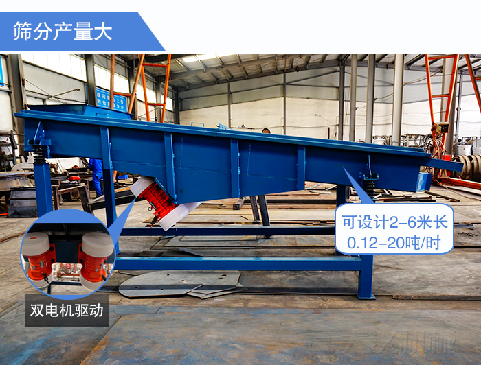 干河沙篩分產(chǎn)量般比較大,這取決于其應(yīng)用場景,直線振動篩為雙電機(jī)驅(qū)動,物料在篩面上受激振力的作用向前跳躍,長度根據(jù)精細(xì)度要求不等可設(shè)計:2-6米長,干河沙直線振動篩型號有DZSF515、DZSF520、DZSF525、DZSF1020、DZSF1025、DZSF1030,每小時產(chǎn)量范圍在0.12-20噸。