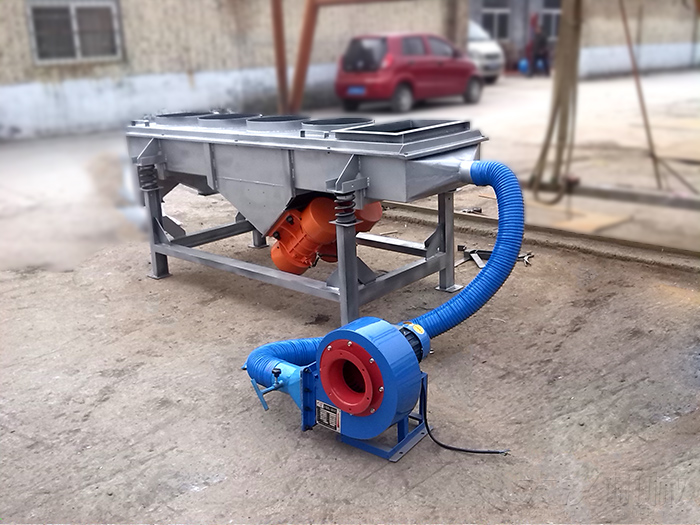 大漢機械降溫直線振動篩這對高溫特性物料設計研發,可在有效降低物料溫度后再對物料進行篩分,有效的提高了篩分效率及處理量,下面以洗衣粉為例說明風冷式振動篩的應用。洗衣粉在剛剛完成生產后,通常為120度左右的高溫,如不進行降溫處理,篩選分級非常困難,而洗衣服不適合傳統的水冷式降溫。在洗衣粉生產線上用“大漢牌”降溫式直線振動篩,剛生產完成120度高溫洗衣粉通過輸送設備直接進入風冷式直線振動篩,經過安裝在設備進料口底部的風機降溫冷卻系統,(不符合要求的結塊物料通過安裝在進料口端的篩網篩選后從出料口旁的小型排料口排出,見下圖,該裝置可根據物料特性選裝),可直接將洗衣粉溫度降至40-50度后再進入直線振動篩完成篩選分級工作。