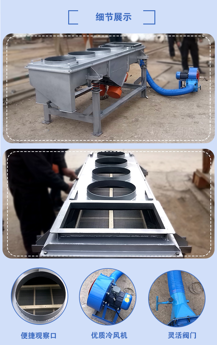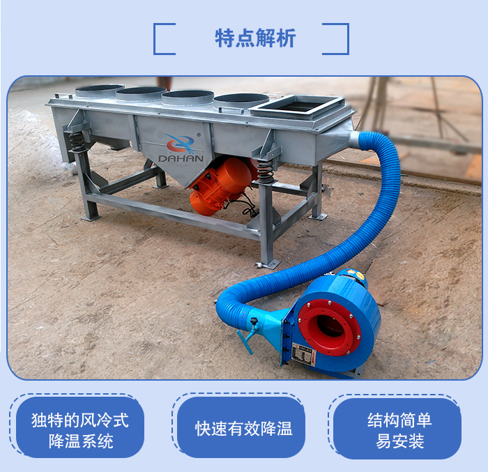 2、獨特的風冷式降溫系統設計,快速有效降溫,降溫后篩分效率更高;
